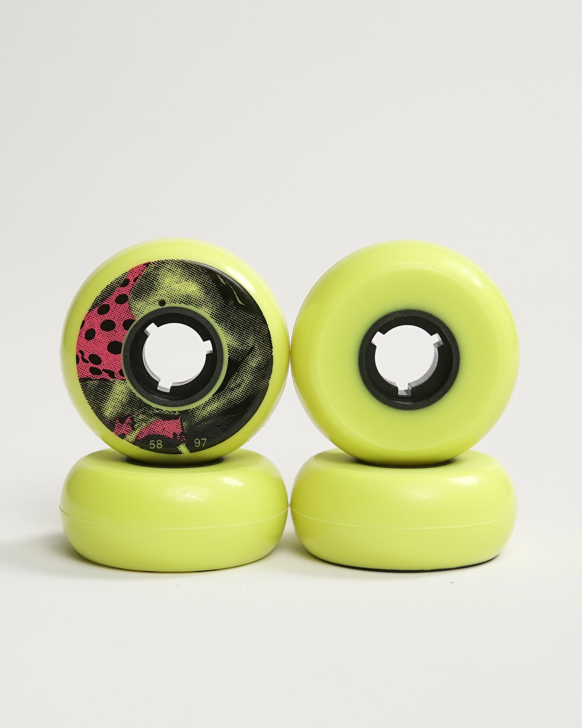 We found that 58mm is the best size for all around street and park skating. It is small enough to keep you close to the ground, and stay out of the way while grinding, yet large enough to last you while skating rough surfaces in the streets. We developed this unique rounded profile to provide a natural feeling of fluidity while rolling and turning.