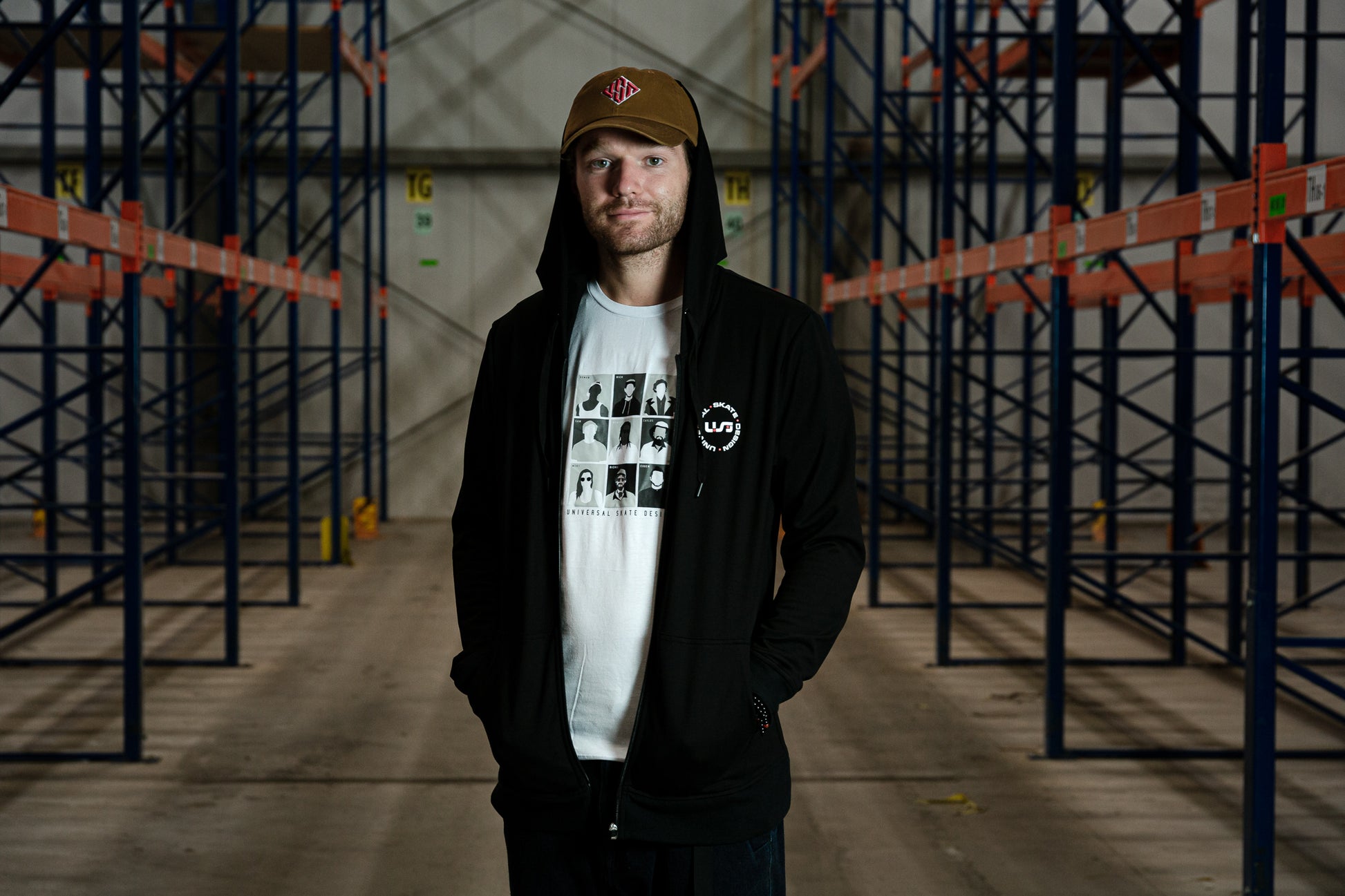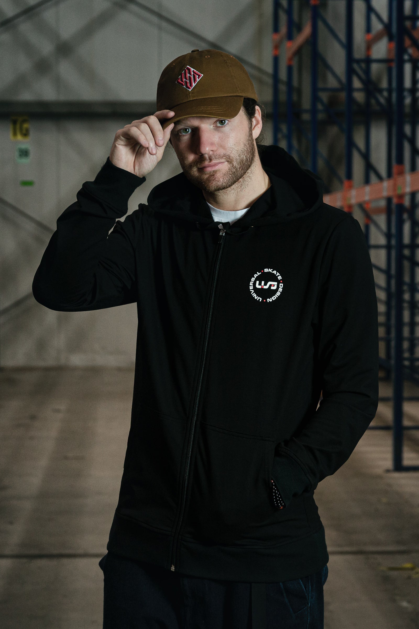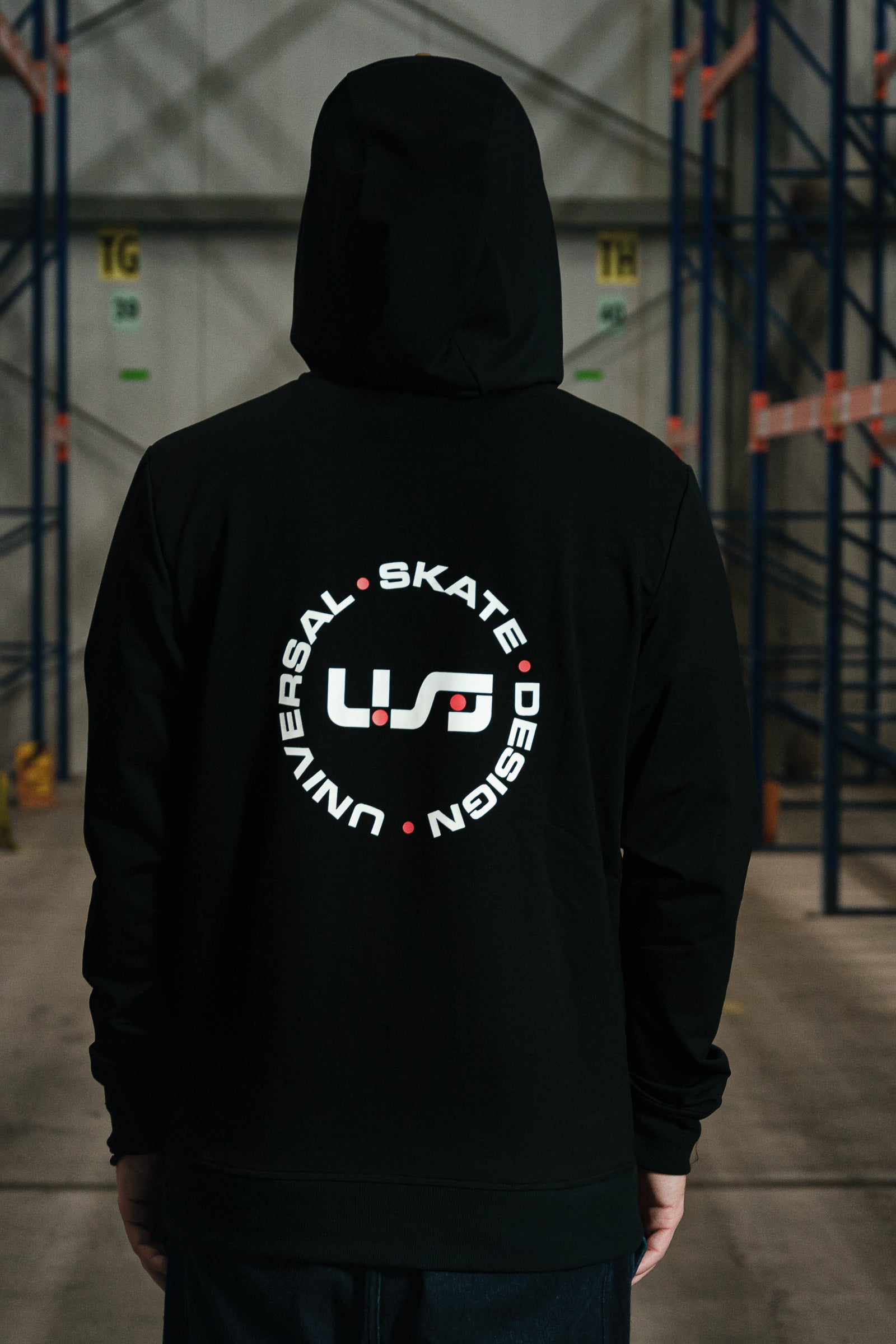 A black long sleeve jacket with a full zip and hood featuring a white and red USD heritage logo on the front