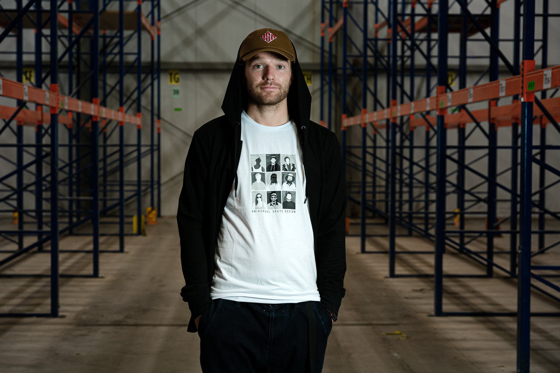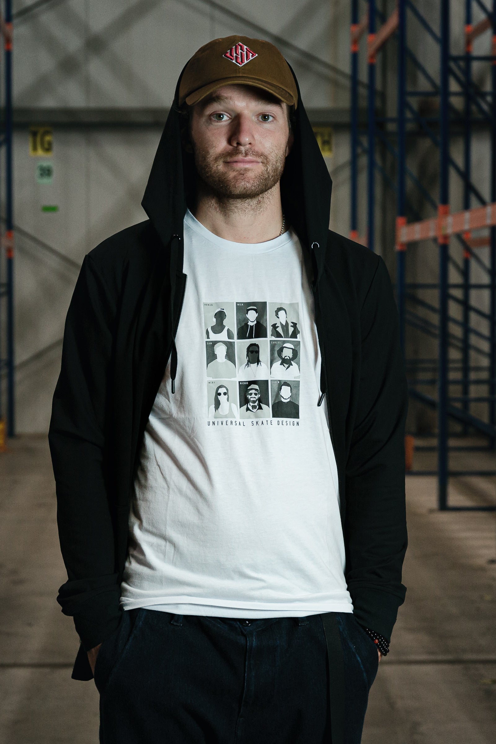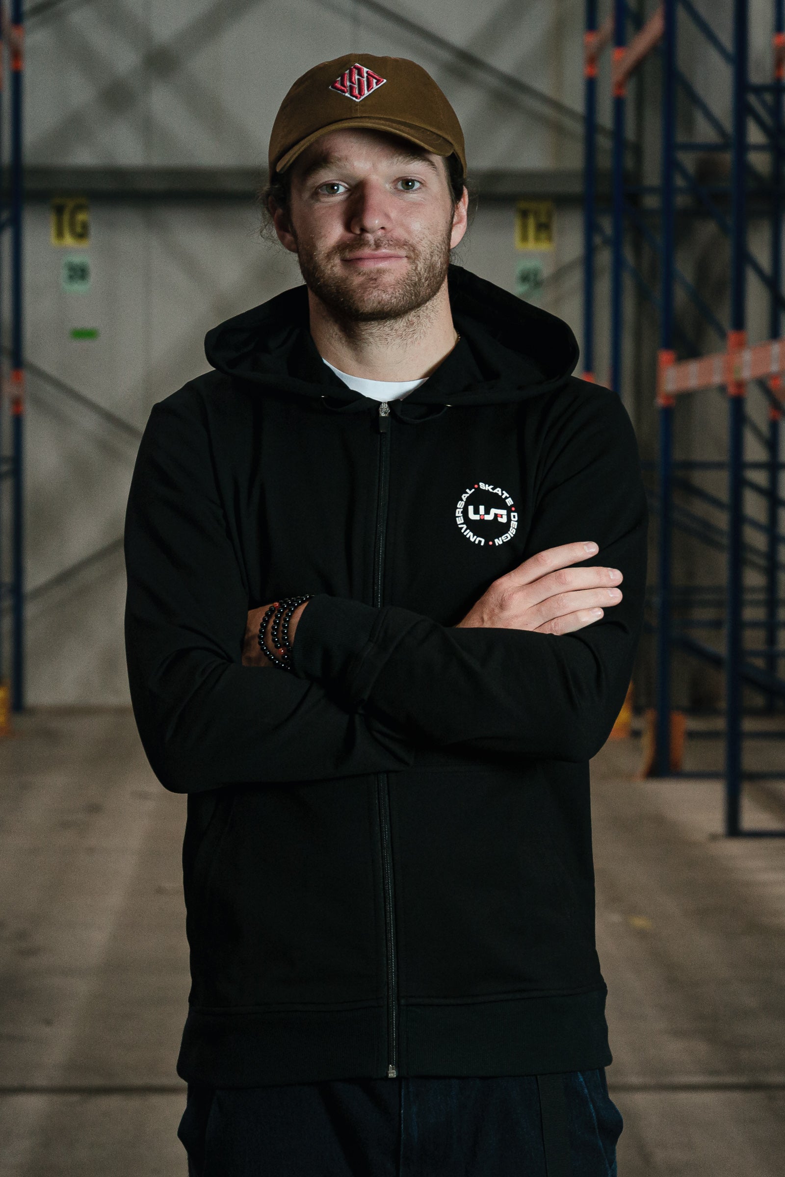 A black long sleeve jacket with a full zip and hood featuring a white and red USD heritage logo on the front