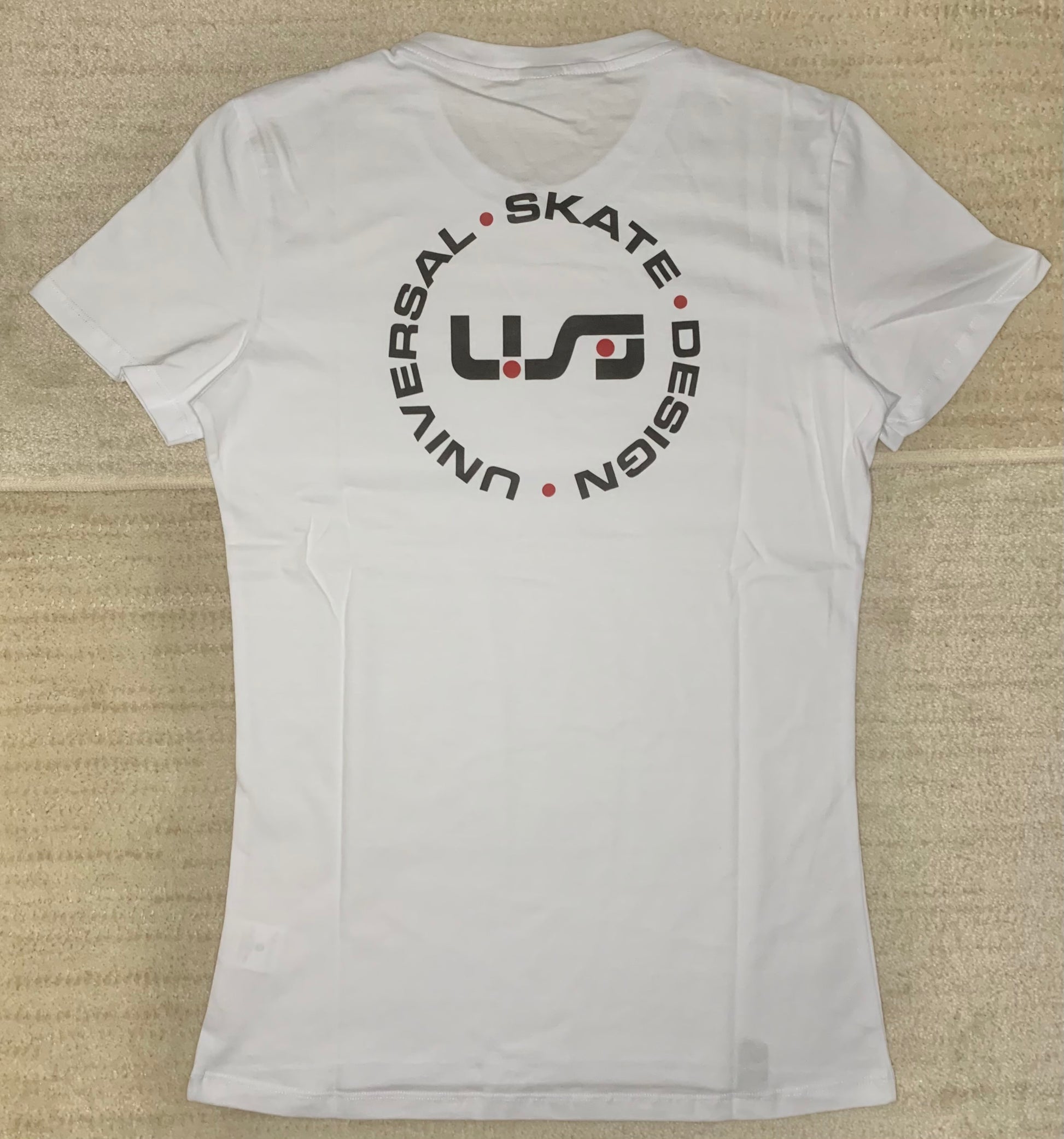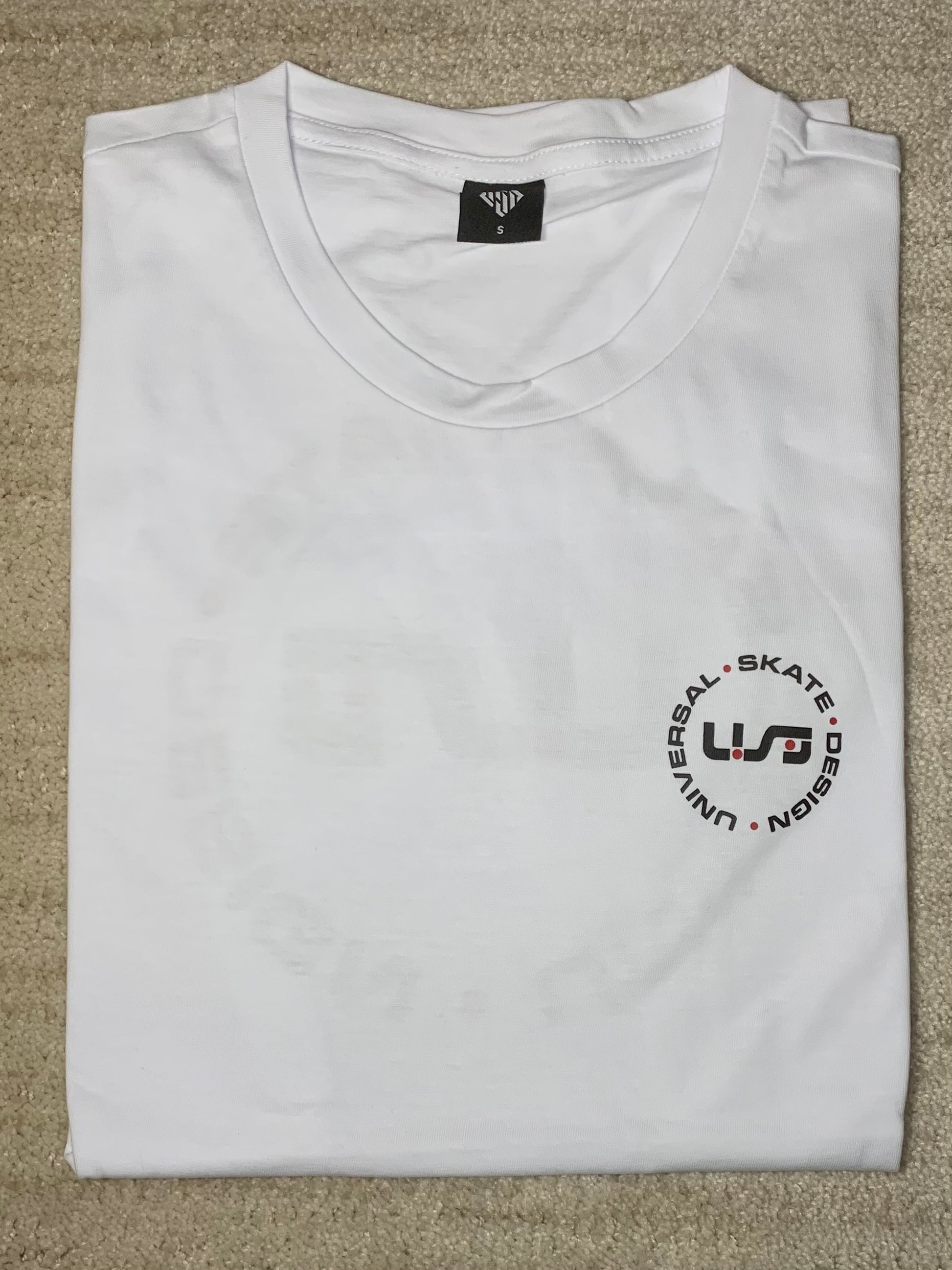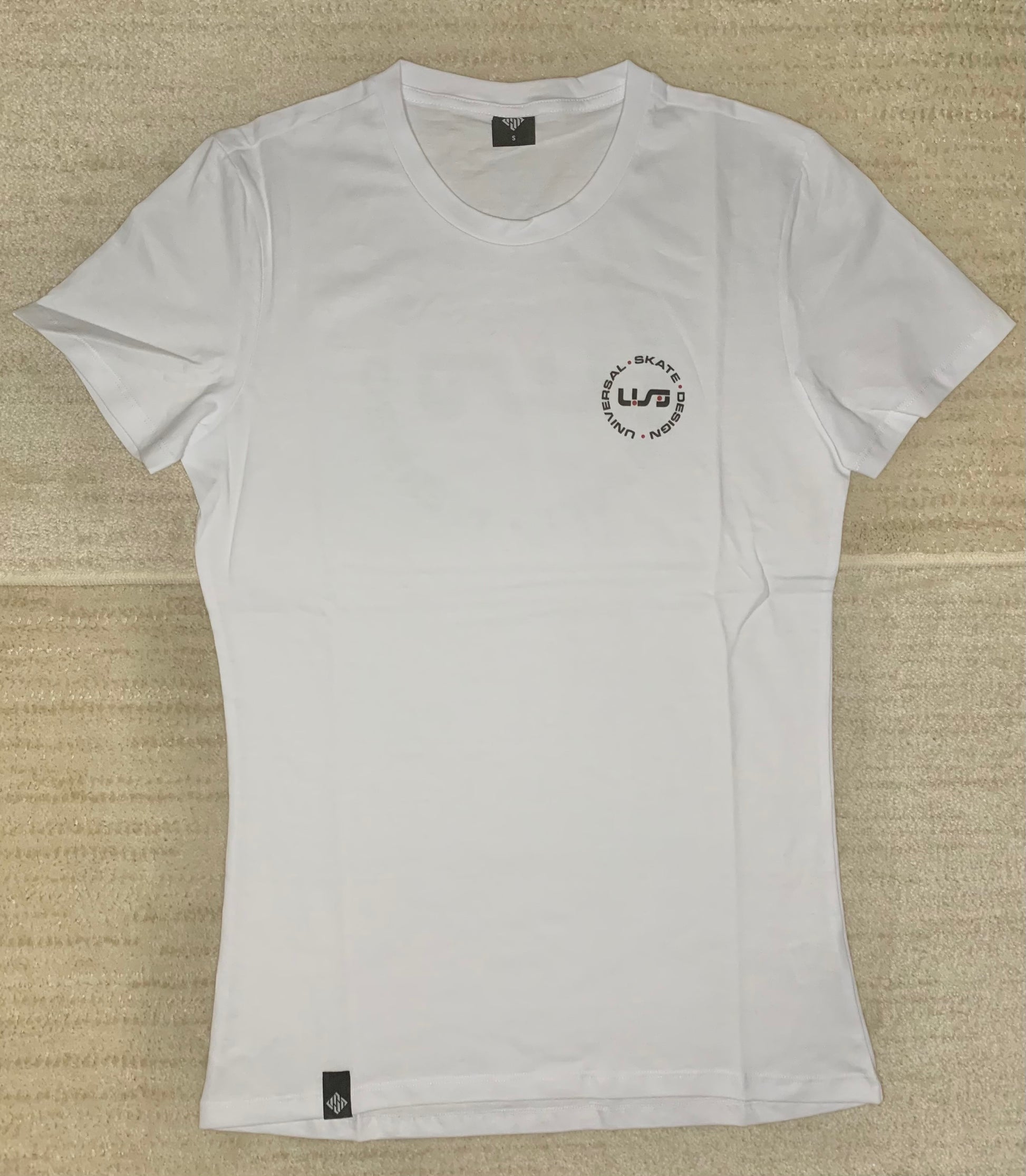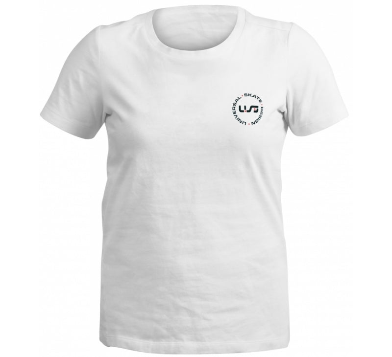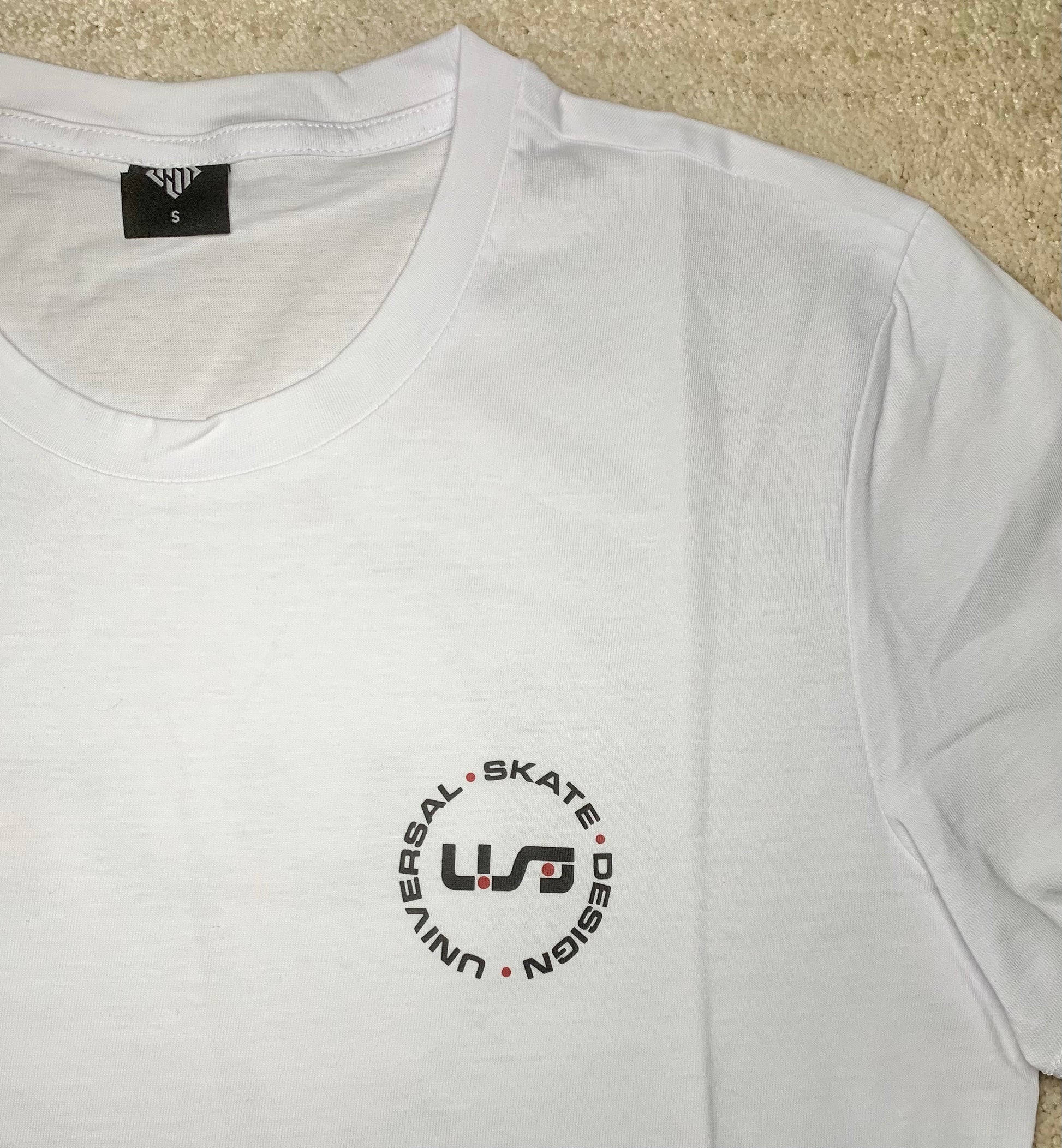 A white, light-weight tee with the black and red USD heritage logo on the front
