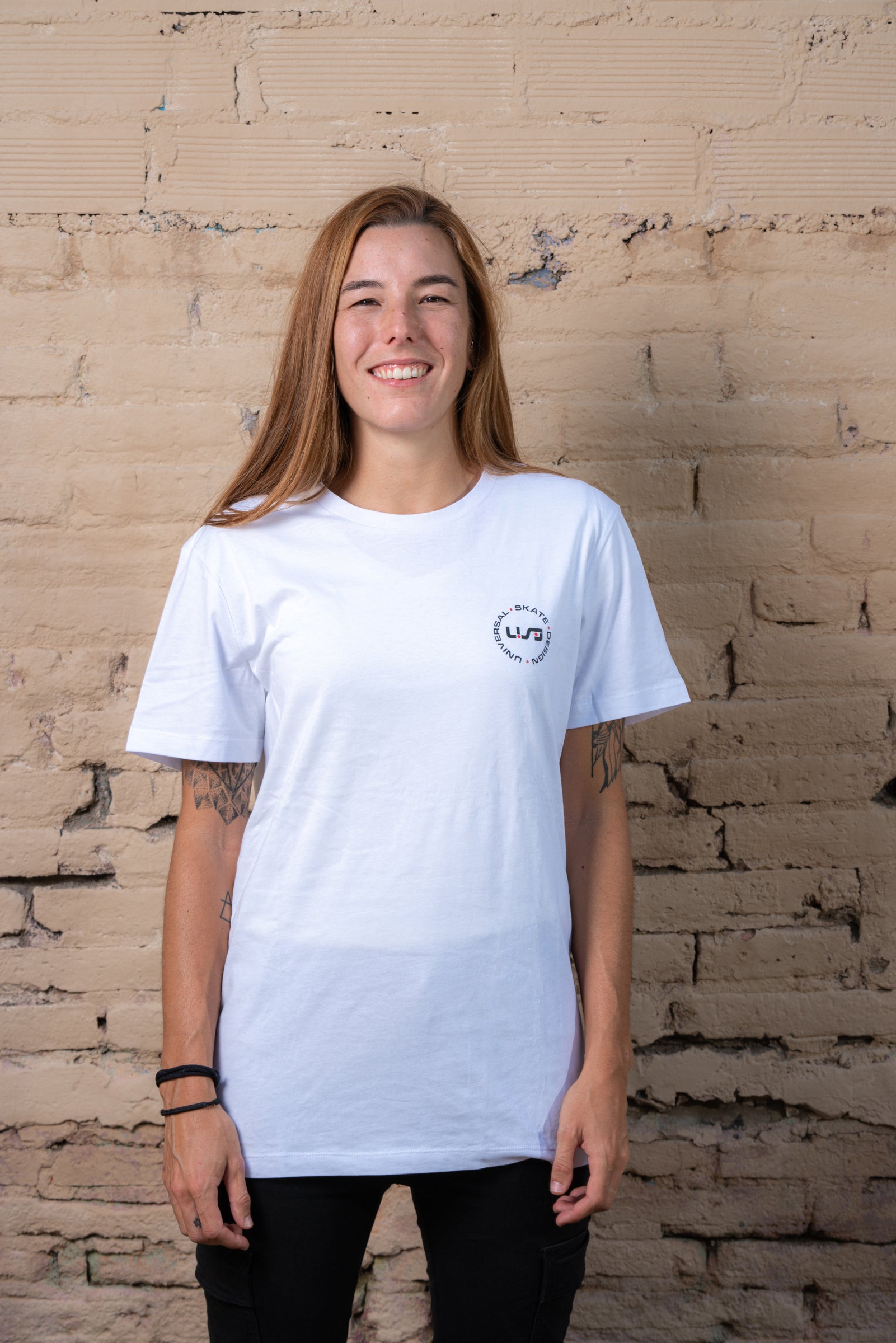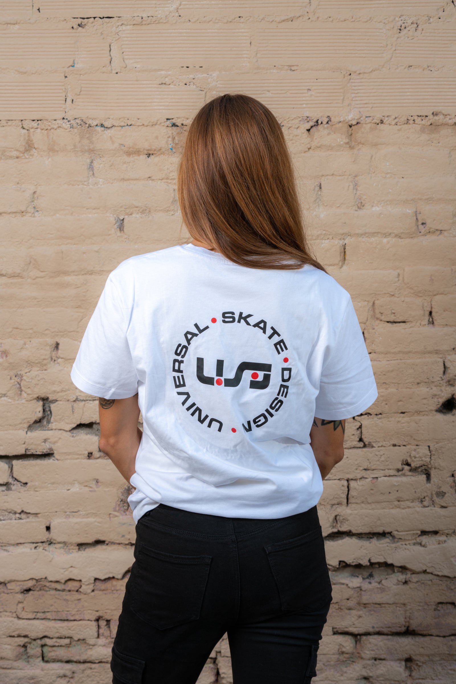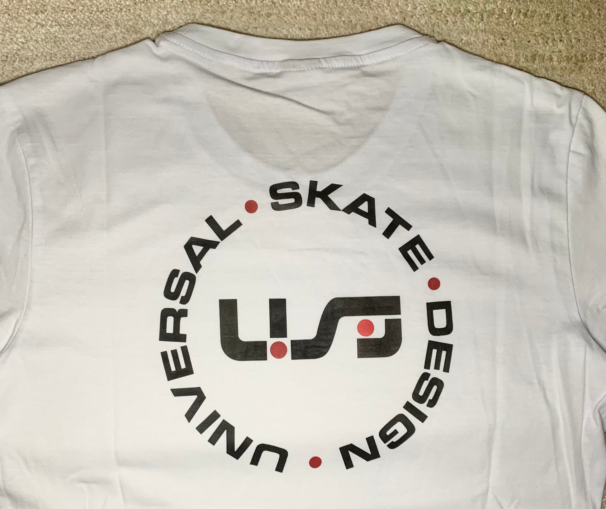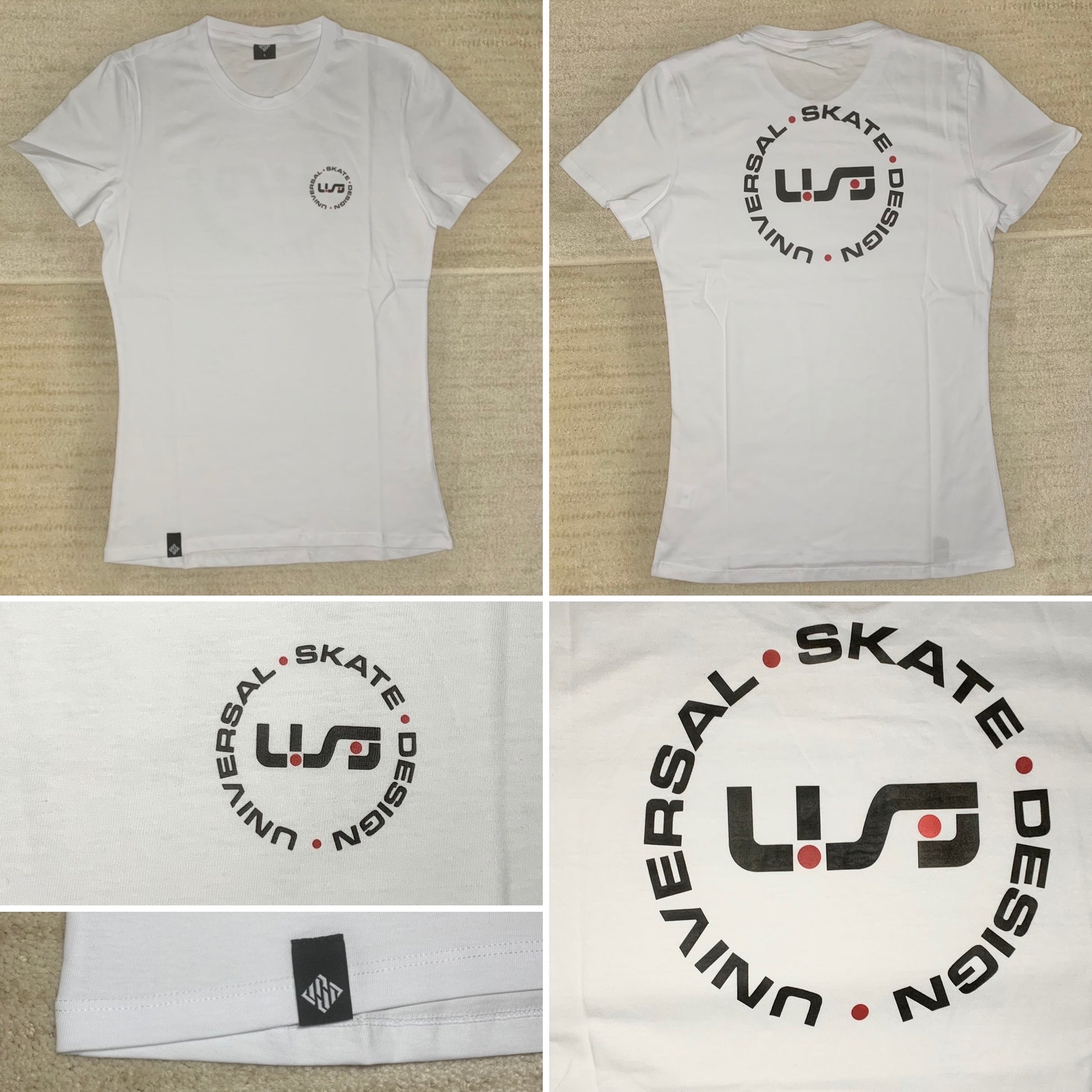 A white, light-weight tee with the black and red USD heritage logo on the front