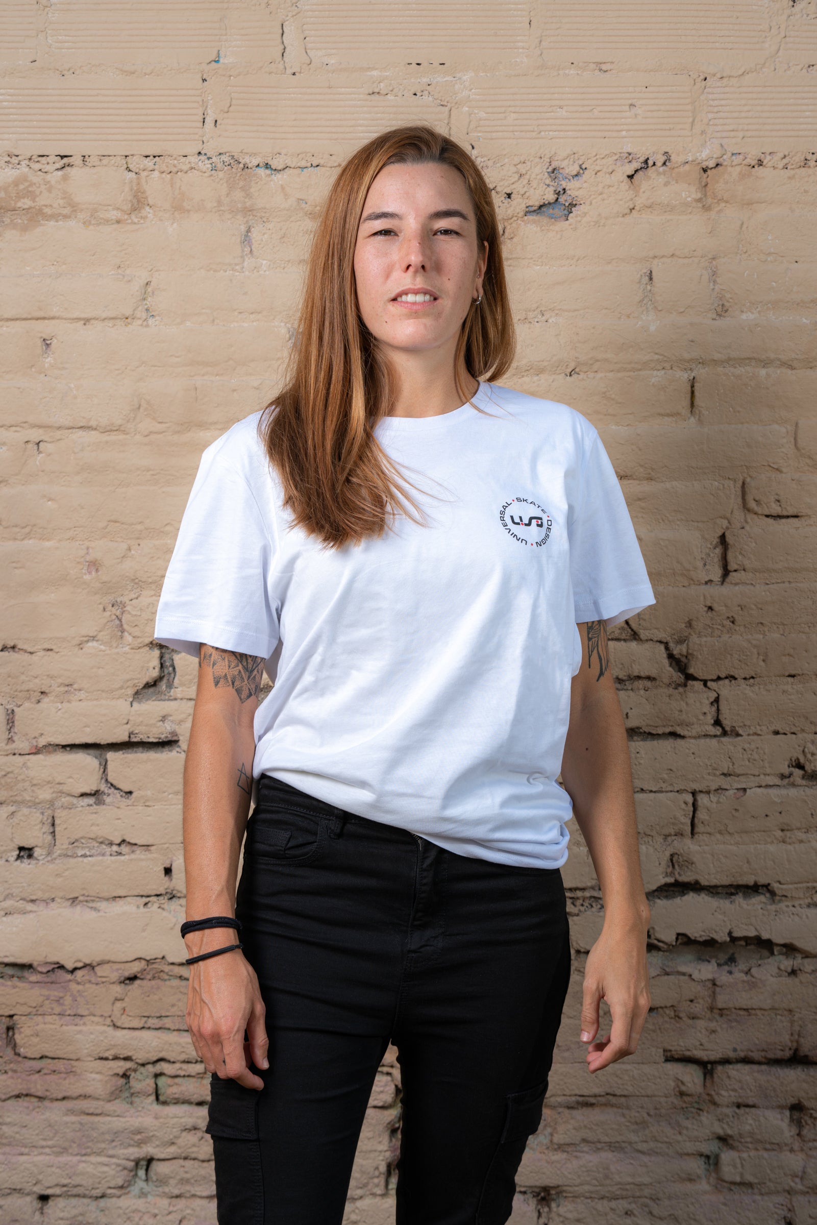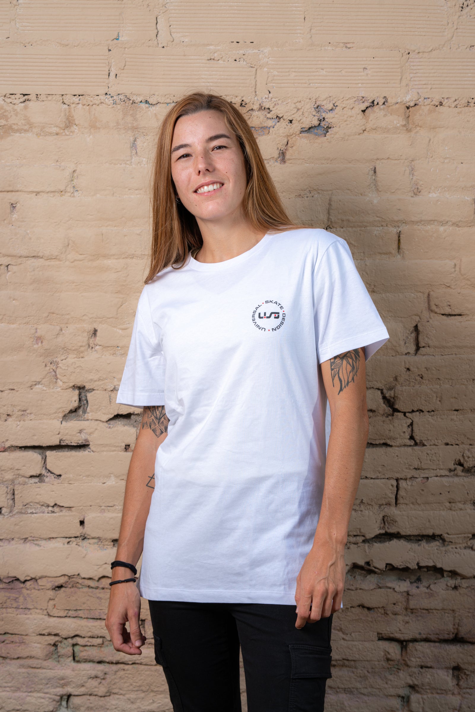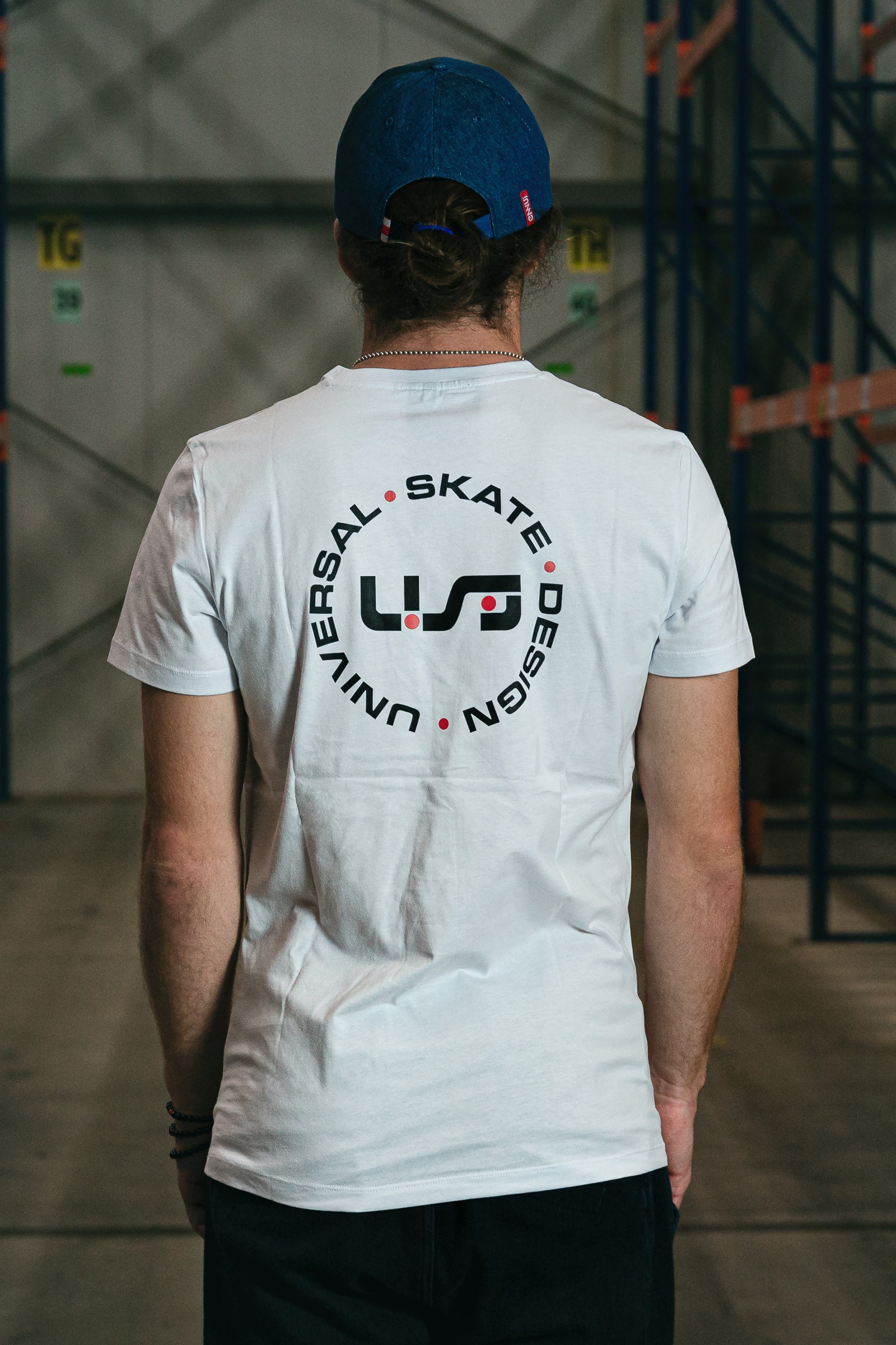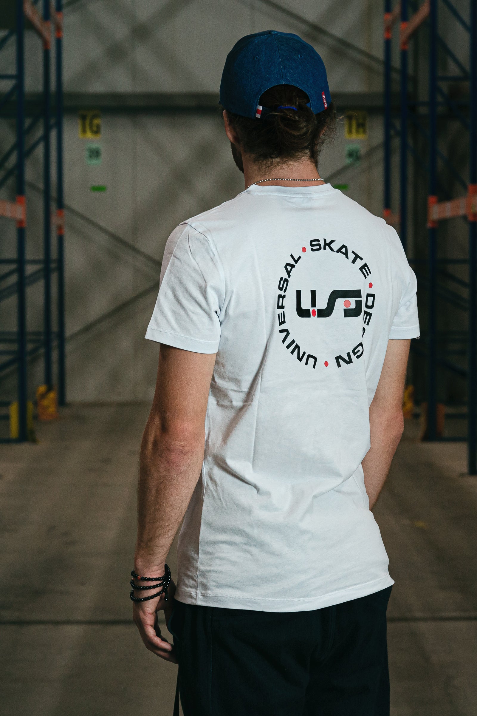 A white, light-weight tee with the black and red USD heritage logo on the front