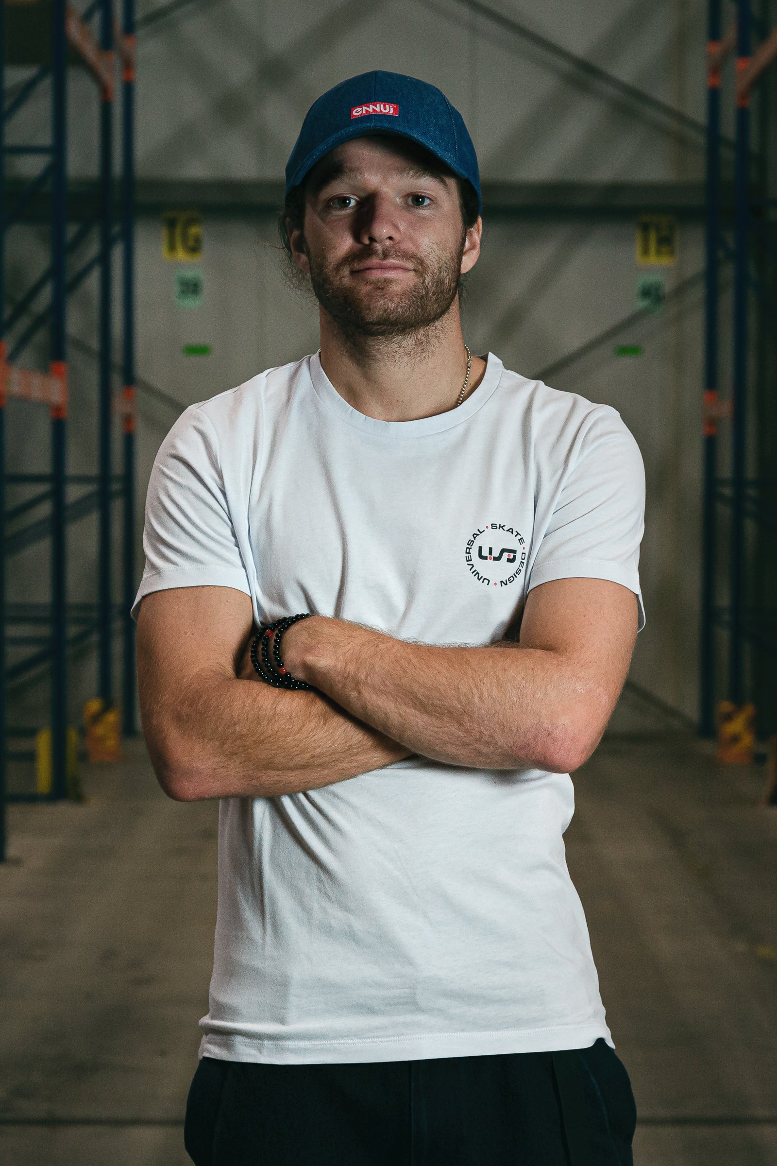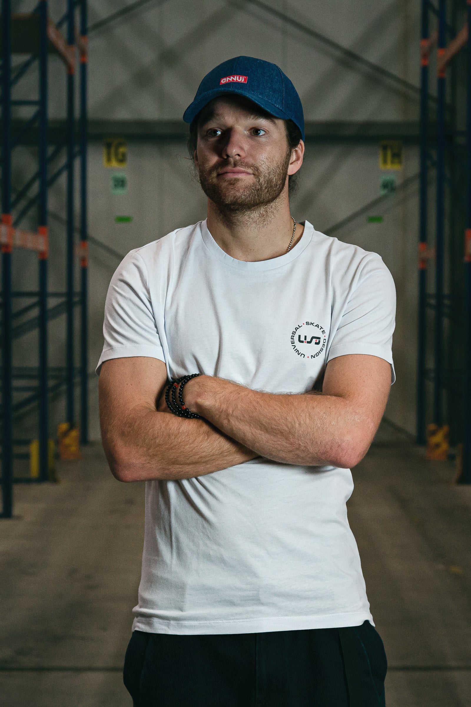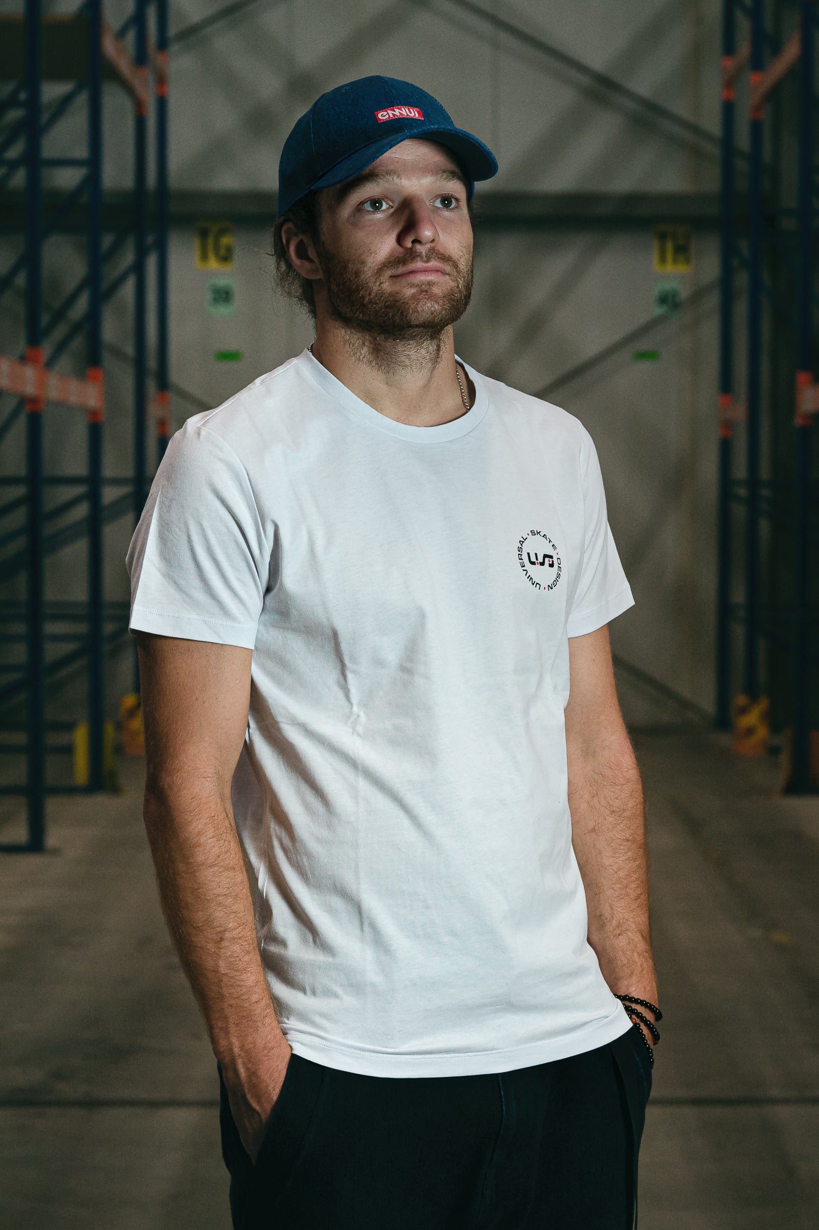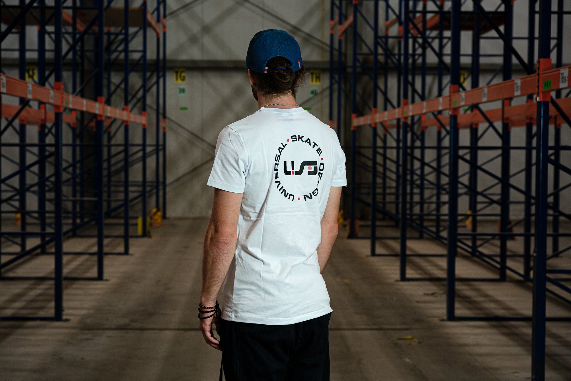 A white, light-weight tee with the black and red USD heritage logo on the front